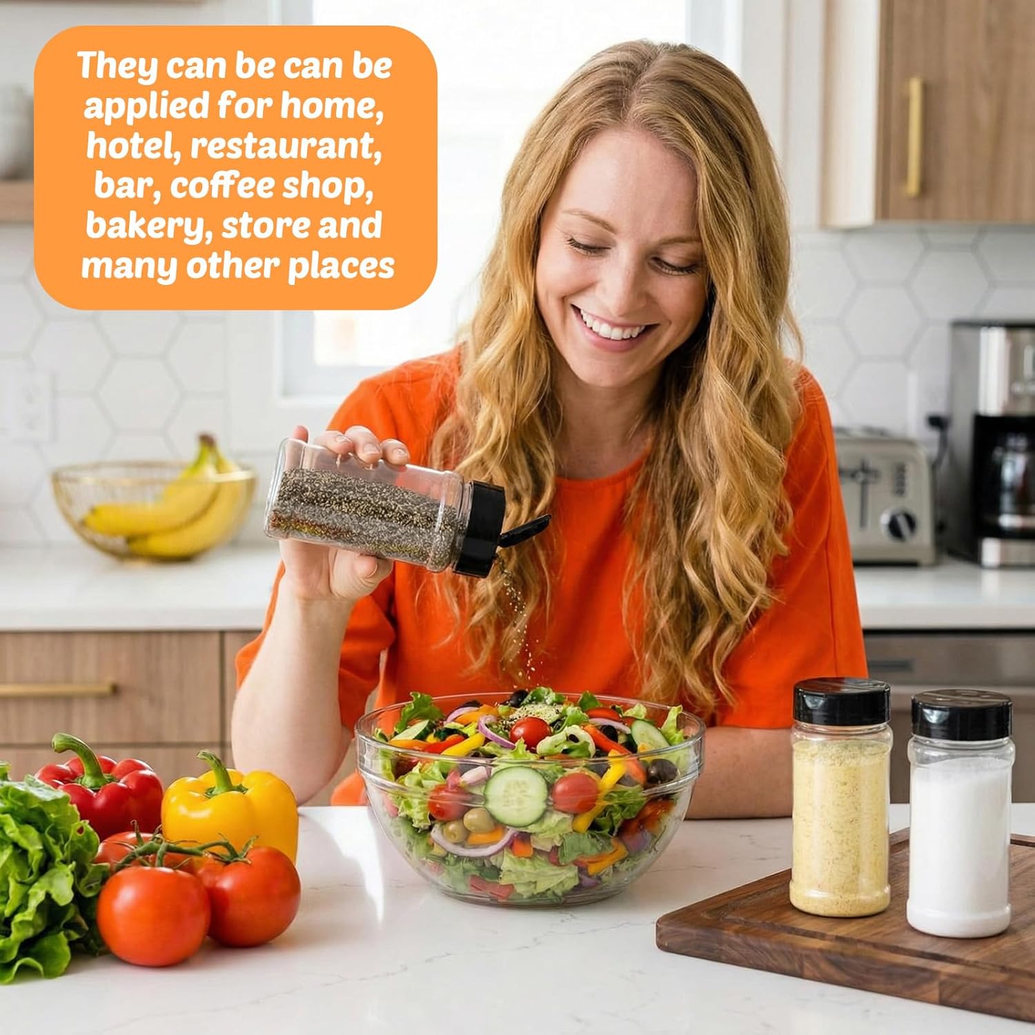 - Bilateral Opening Lid Design: the plastic shaker container for spices features in bilateral opening lid design. which can be shaken to add spices. and the transparent bottle design allows you to clearly see how many things are left inside. bringing you a nice using experience
