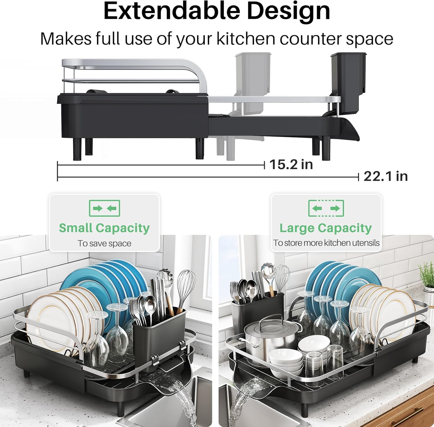 - Expandable Design: SNTD's dish drying rack adapts to your kitchen—its width flexes from 15.2 to 22.1. making it a storage solution for small kitchens or apartments. Tight on space? Retract it to fit compact counters. Post-dinner rush with stacks of dishes? Extend for all the extra drying room you need